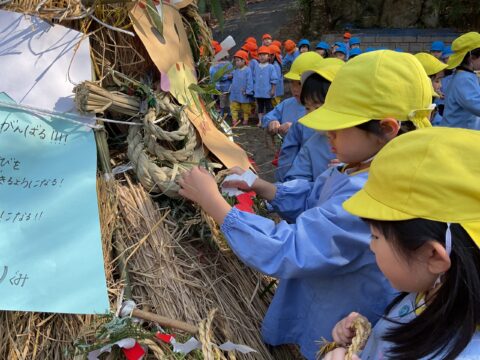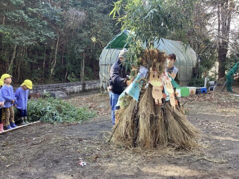 そこに各クラス目標を書いたお正月飾りやしめ縄を付けてとんどが完成🌿